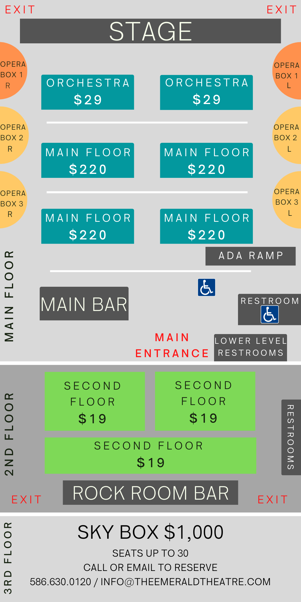 Sky Box $1,000 Includes seating and admission for 30, commemorative lanyard for each guest, private bar and bartender. Appetizers available, call for selections and pricing. Located on the third floor of the theatre. To book please call (586) 630-0120 or email Info@TheEmeraldTheatre.com.