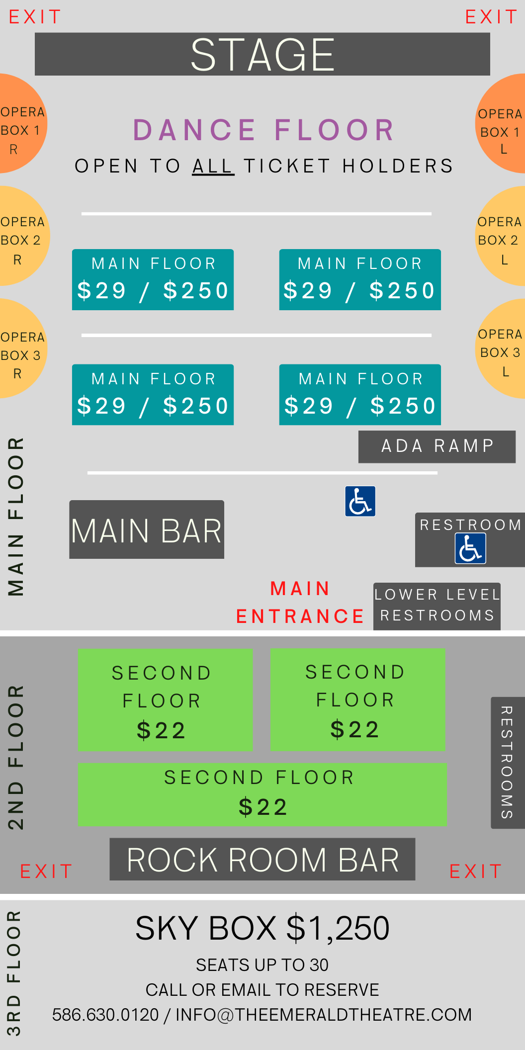 Sky Box $1,250 Includes seating and admission for 30, commemorative lanyard for each guest, private bar and bartender. Appetizers available, call for selections and pricing. Located on the third floor of the theatre. To book please call (586) 630-0120 or email Info@TheEmeraldTheatre.com.