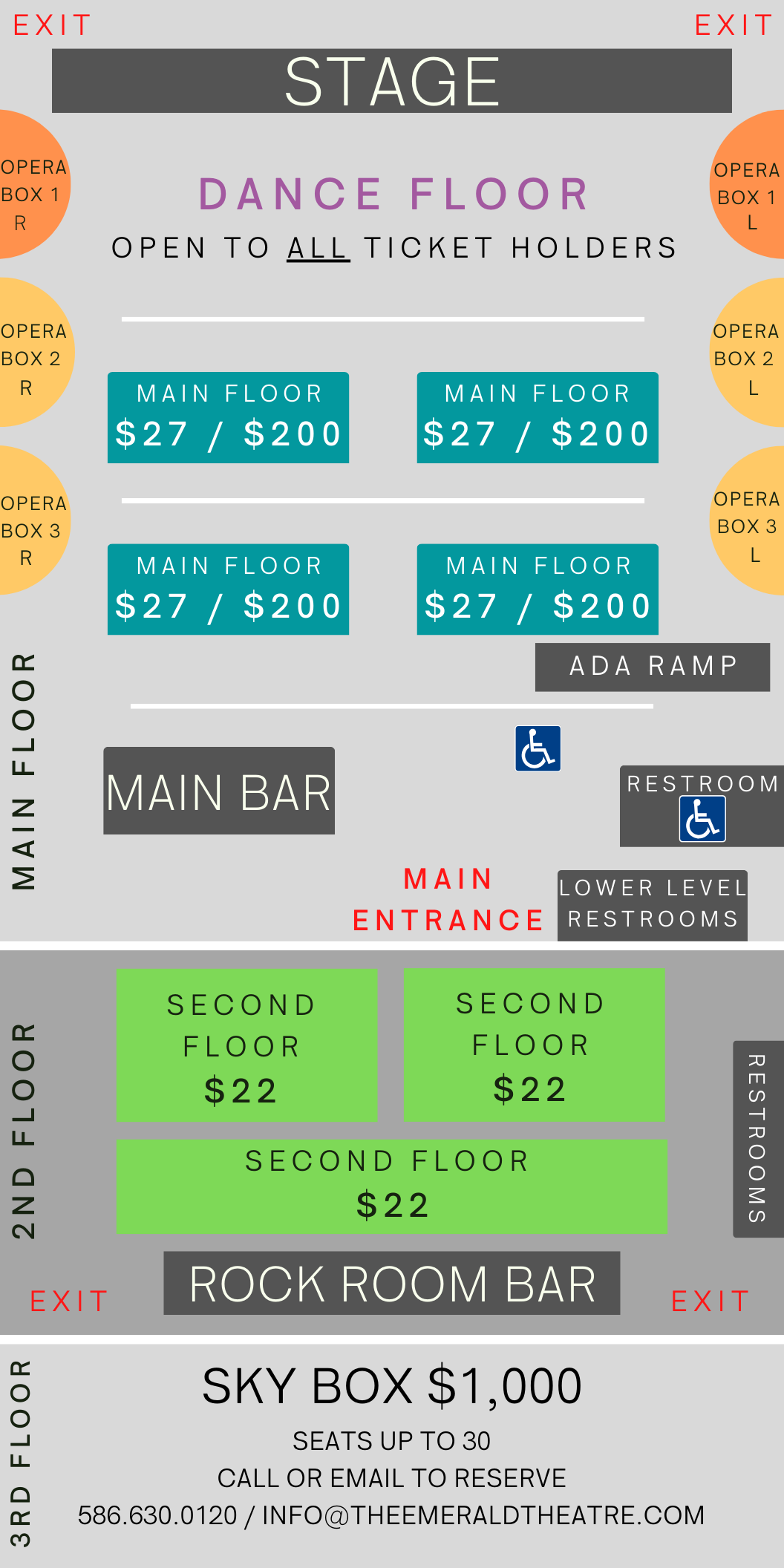 Sky Box $1,000 Includes seating and admission for 30, commemorative lanyard for each guest, private bar and bartender. Appetizers available, call for selections and pricing. Located on the third floor of the theatre. To book please call (586) 630-0120 or email Info@TheEmeraldTheatre.com.